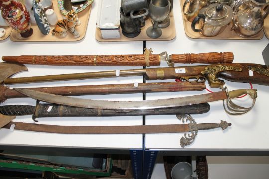 A collection of antique style weapons including Indian sabre, double headed axe, musket etc.
