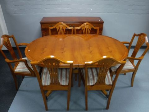 A reproduction yew wood twin pedestal dining table and six chairs