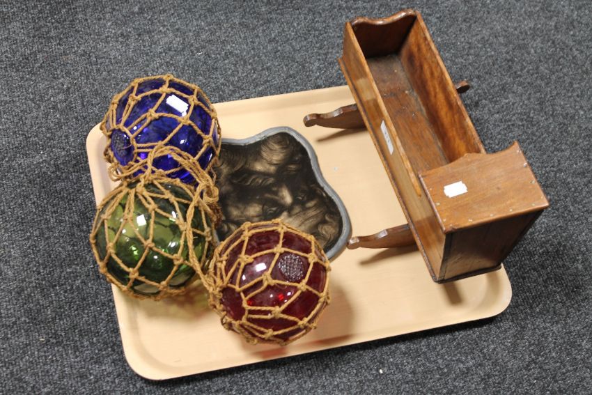 A tray of antique glass balls, miniature crib, leaded glass panel