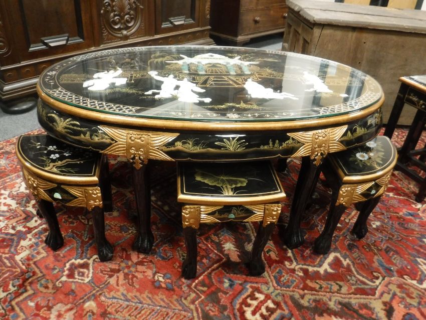 A Japanese lacquered large oval coffee table, with nest stools beneath, decorated with mother of pearl figures