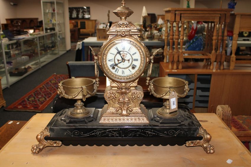A nineteenth century ornate cast metal clock garniture, by the Ansonia Clock Company
