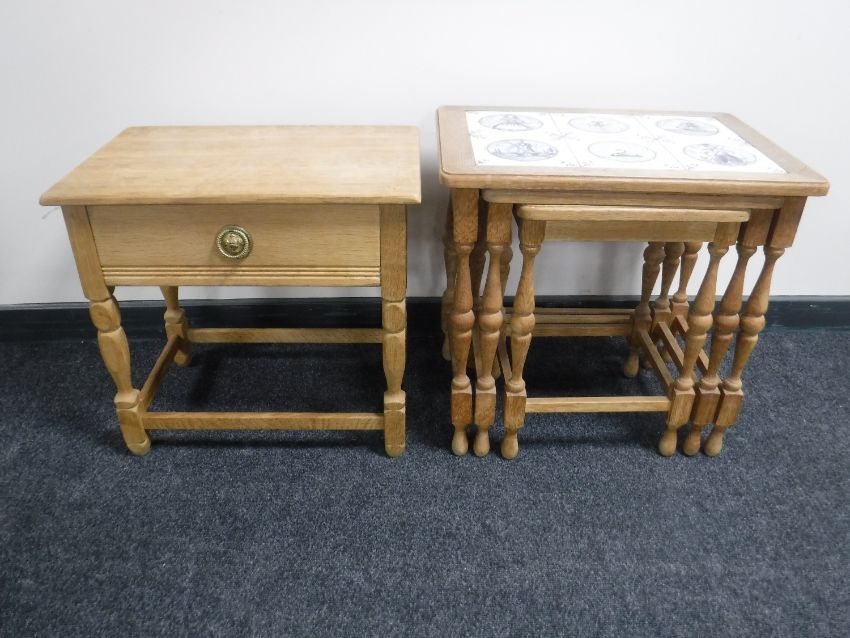 A nest of oak tiled topped tables and a small oak table fitted a drawer