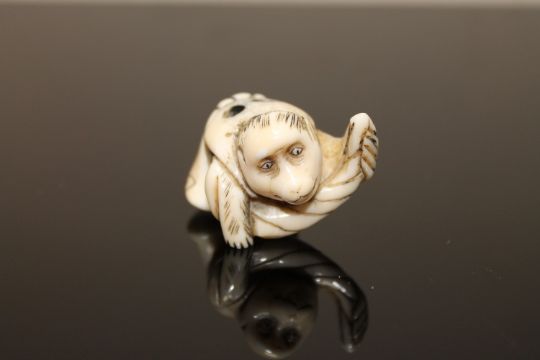 A Meiji Japanese marine ivory netsuke modelled as a monkey wearing a kimono, crouching holding twisted fabric, character mark to base.