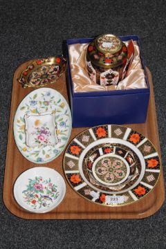 A tray containing four pieces of Royal Crown Derby Imari porcelain including boxed ginger jar, together with a Derby Posies pattern small dish, an Aynsley circular shallow dish and a Minton oval porcelain dish