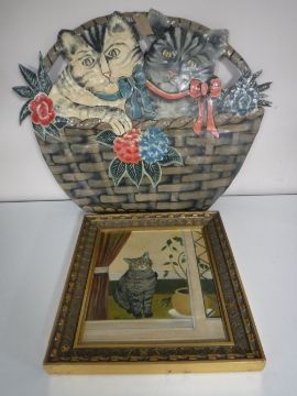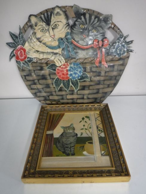 A framed Kate McGowan oil on board - Cat, together with a metal wall plaque, two cats in a basket