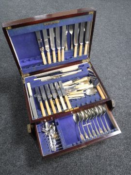 An antique mahogany cutlery canteen fitted with two drawers containing stainless steel and plated cutlery
