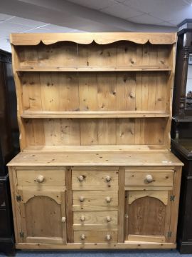A stripped pine kitchen dresser