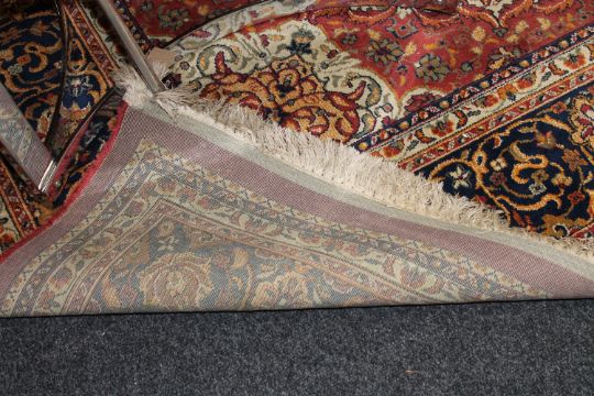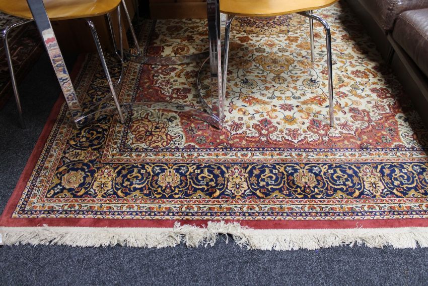A silk finished machine made fringed floral rug on red ground
