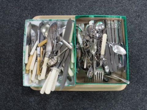 A tray of stainless steel and plated cutlery plus sugar tongs