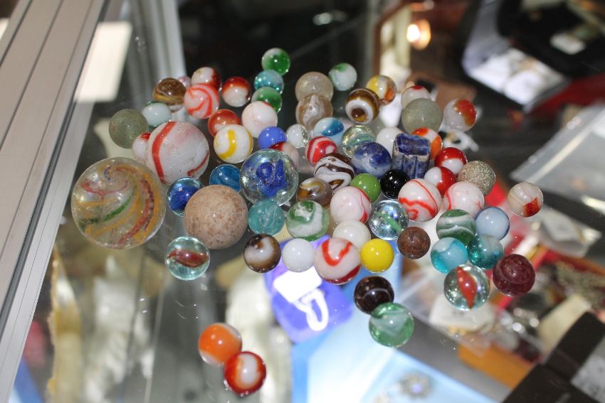 A tray of pair of cased field glasses, ships compass, cased Balco Ohms meter, vintage marbles etc