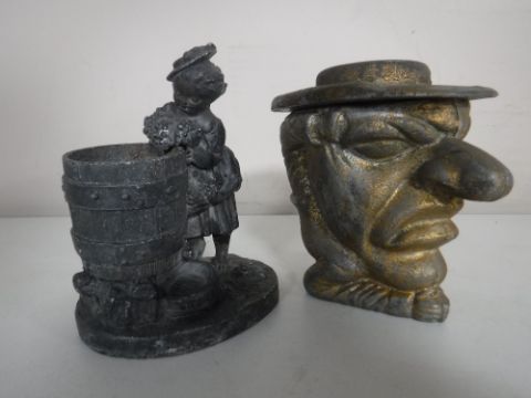 A gilded metal Mr Punch lidded jar together with a metal figure - Girl at well. (2)