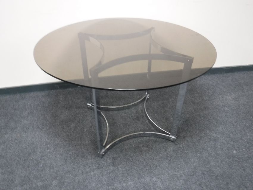 A circular smoked glass topped dining table on metal pedestal by Merrow Associates