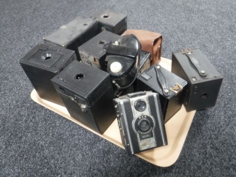 A box of ten vintage cameras including a portrait Hawkeye, boxed Brownie etc