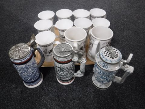 Three pewter lidded Avon tankards together with a tray of nineteen Newcastle china oversized mugs and two Franklin porcelain Ashes tankards