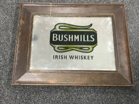 An early 20th century and later oak framed mirror bearing "Bushmills Irish Whiskey" advertisement