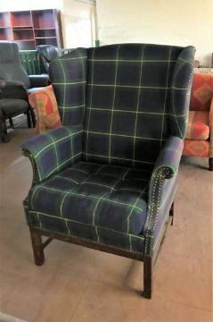 A twentieth century wing back armchair upholstered in a tartan fabric