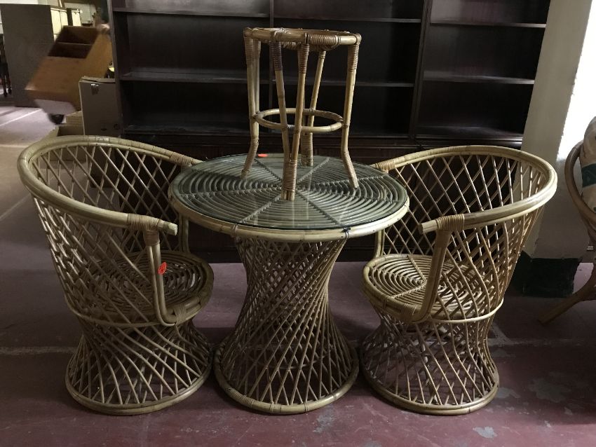 A three piece conservatory suite, together with a bamboo and wicker circular table, pair of chairs and matching plant stand