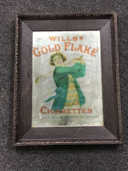 An early 20th century and later oak framed mirror bearing "Willows Gold Flake Cigarettes" advertisement