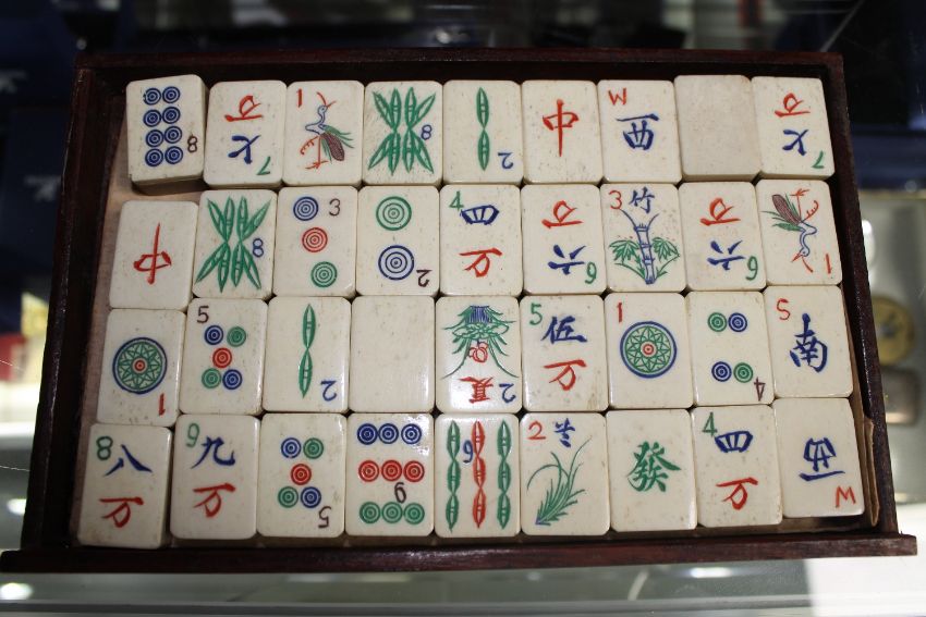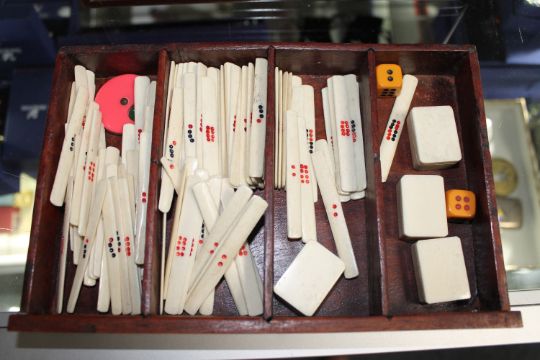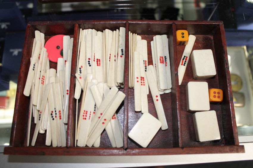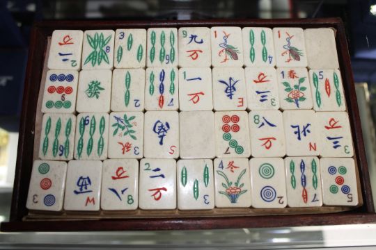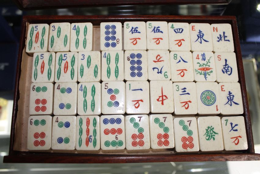The tiles are 3cm by 2cm. The box is generally in good condition save for the fact that the board that the middle drawer rests on is not level. As a result the middle drawers get in the way of each other.