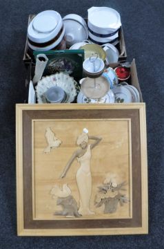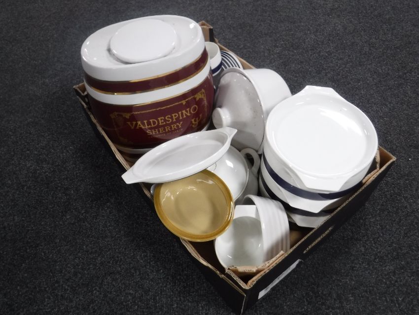 Two boxes containing a china Valdespino sherry barrel, Denby dinner ware, Thomas tureens, together with a wooden wall panel