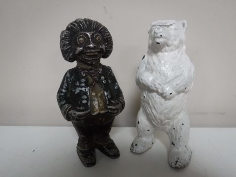A cast metal figure of a bear together with a cast metal money box