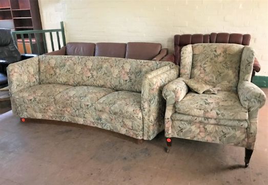 An early twentieth century shaped three seater settee and wing back armchair, upholstered in a floral fabric