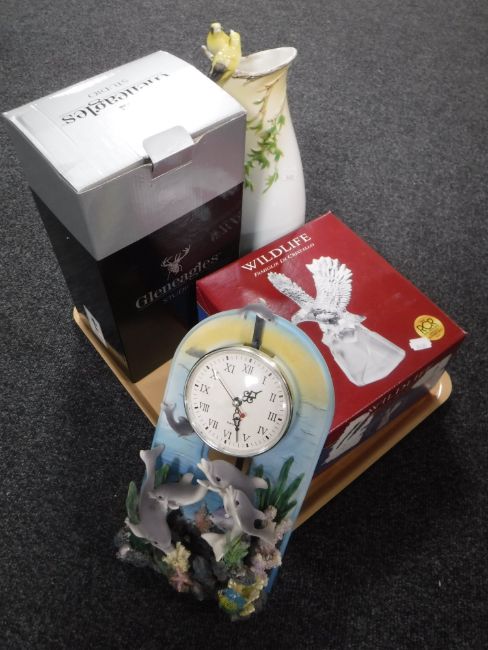 A boxed Glen Eagles Art Deco figure, a boxed RCR wildlife figure of an eagle, embossed vase, contemporary mantel clock