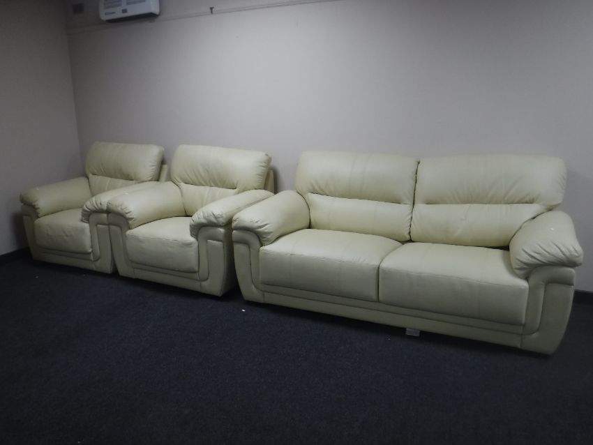 A three piece cream leather lounge suite