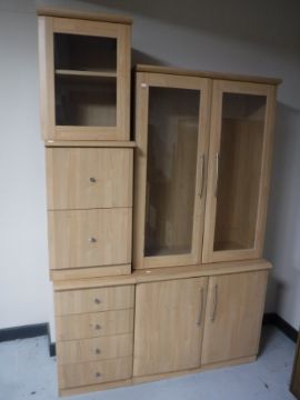 An office stationary cupboard, two office chests and glazed door cabinet