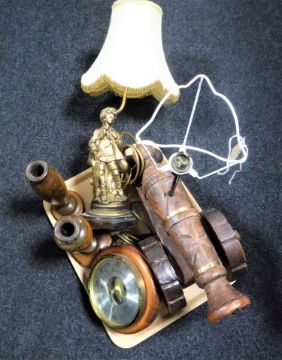 A tray containing a figural table lamp of a street seller, wooden cannon table lamp, pair of wooden vases together with a barometer