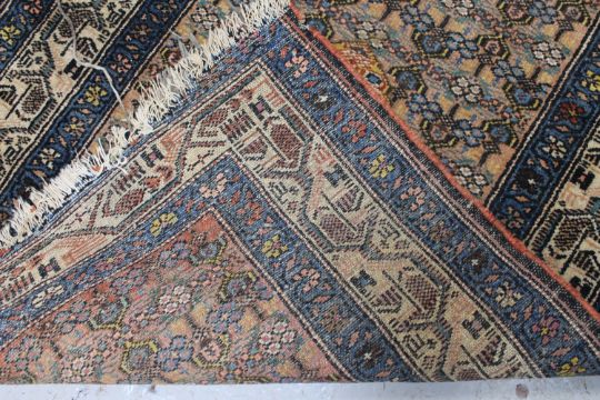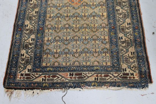 Losses at both ends. Fringes unstable. Some wear to selvedges. Needs cleaning. Pile generally good. 355cm by 102cm. See images.