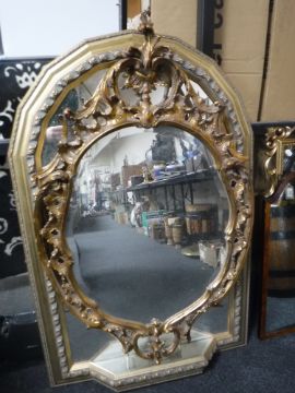 A gilt framed arched sectional mirror with shelf and a gilt Rococo style mirror