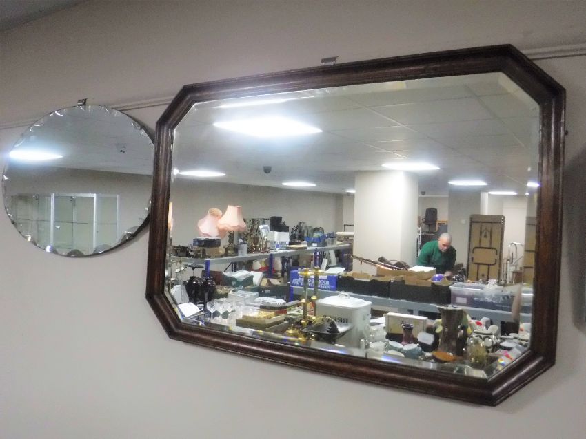 An early 20th century octagonal oak framed bevelled mirror together with a frameless mirror