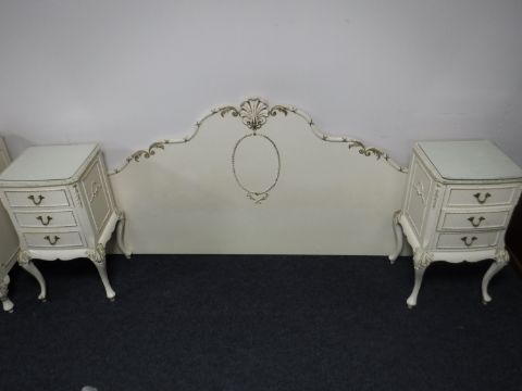 A cream and gilt continental headboard together with pair of matching bedside chests