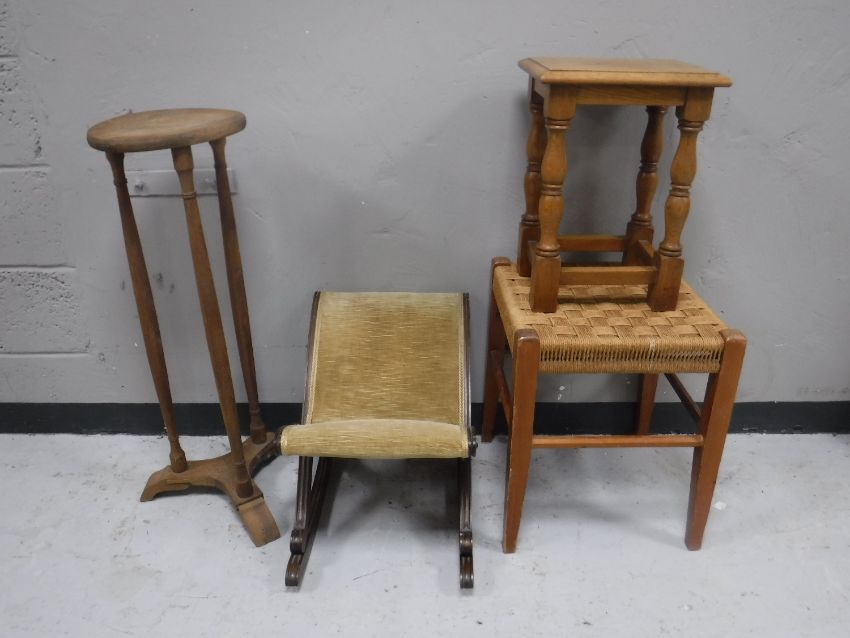 A twentieth century pine rush seated stool, together with a gout stool, oak plant stand and an oak stool