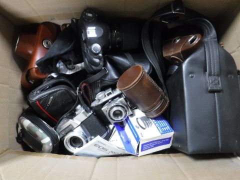 A box of assorted cameras and accessories