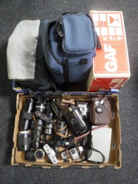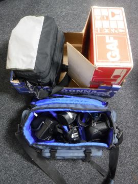 Two camera bags and a box of assorted cameras, lenses including Praktika and Minolta, Gaf slide projector