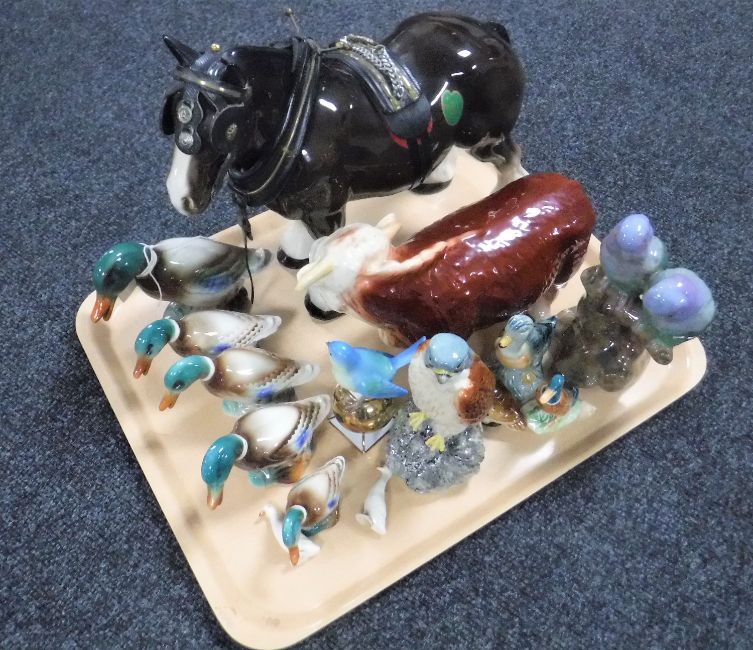 A tray containing china animal figures, Melba ware shire horse and Hereford bull, set of six duck figures, Beswick duck and Beneagles kestrel decanter etc