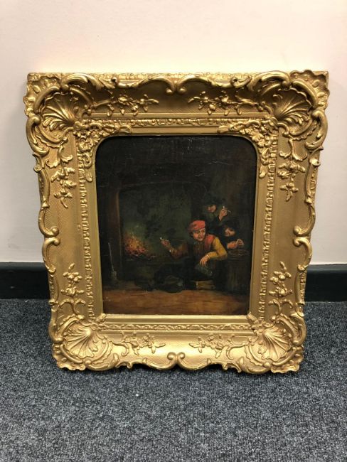 Continental school : Figures By a Fireplace, oil on panel, 24cm x 29cm, framed