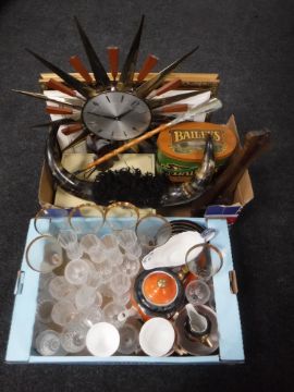 Two boxes of glass ware, Japanese tea service, late twentieth century battery operated sunburst clock, cow horns, barometer etc