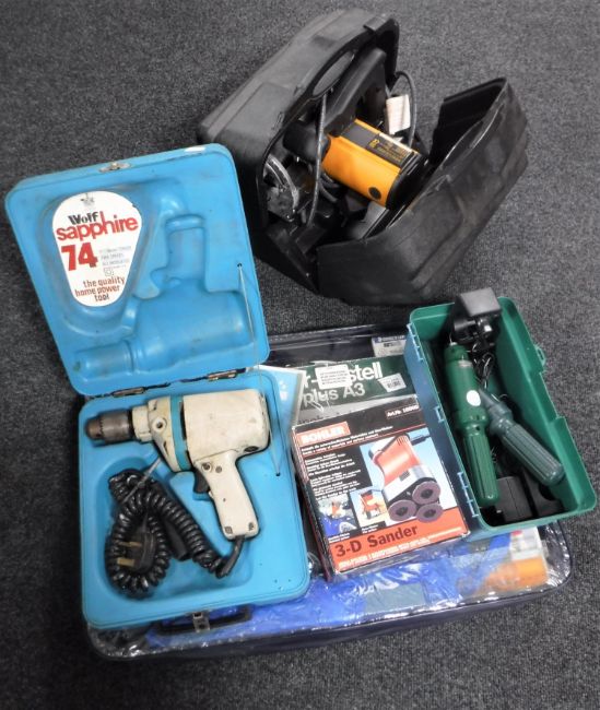 A collection of tools including Wolf drill etc.