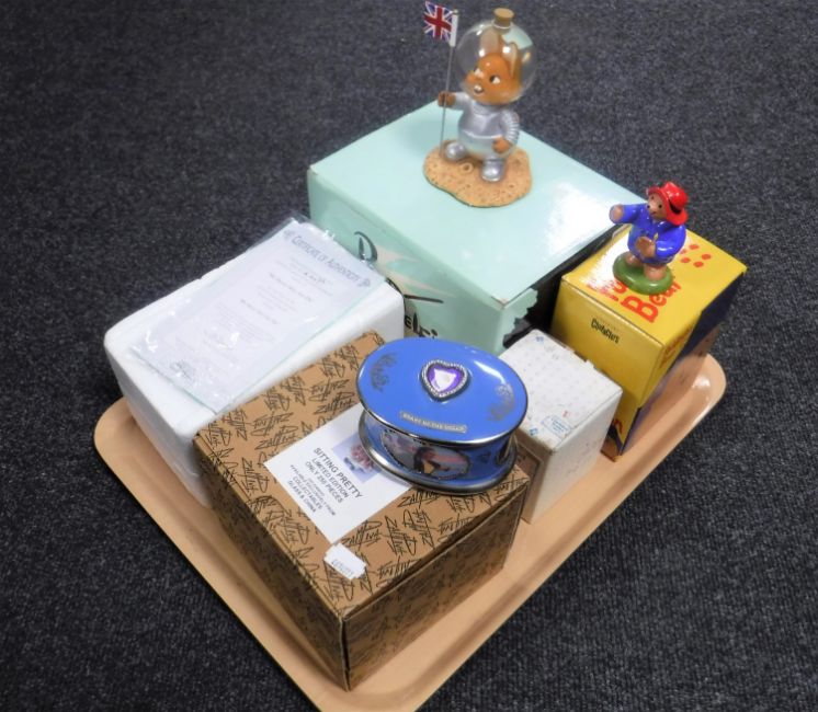 A tray of boxed Pendelfin 2005 Event Piece Astronaught, Coalport Characters Paddington Bear signed by the artist, Titantic My Heart Will Go On music box with certificate, Cherished Teddies Matthew and Zampina figure - Sitting Pretty (all boxed)