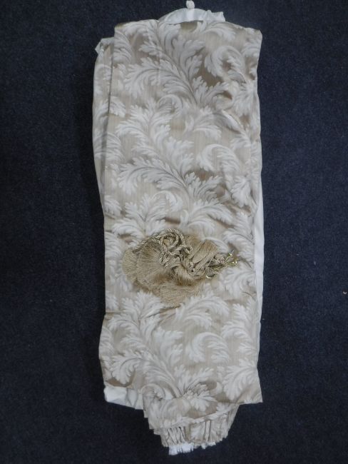 A pair of gold coloured floral curtains with tie backs