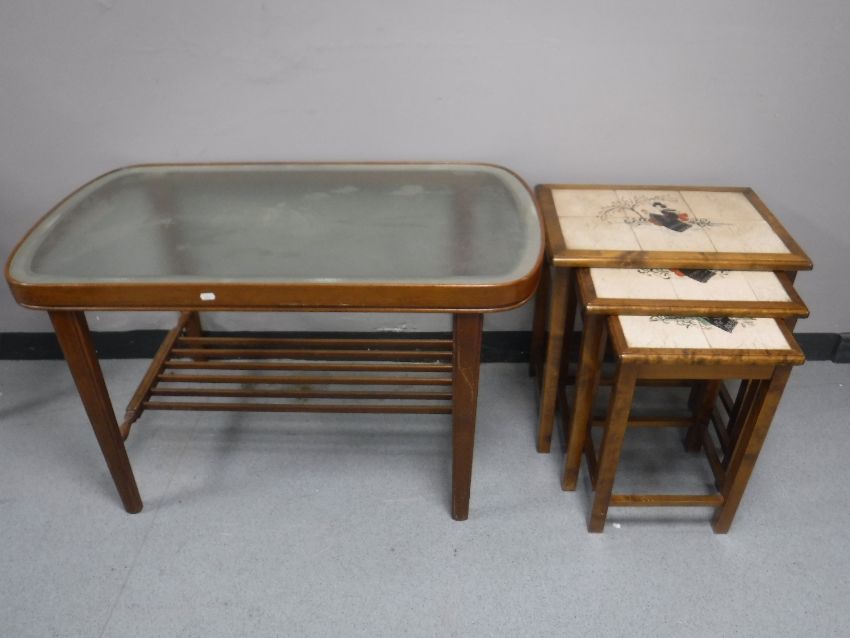 A mid 20th century Danish teak coffee table with glazed etched glass panel and a nest of three tiled topped tables