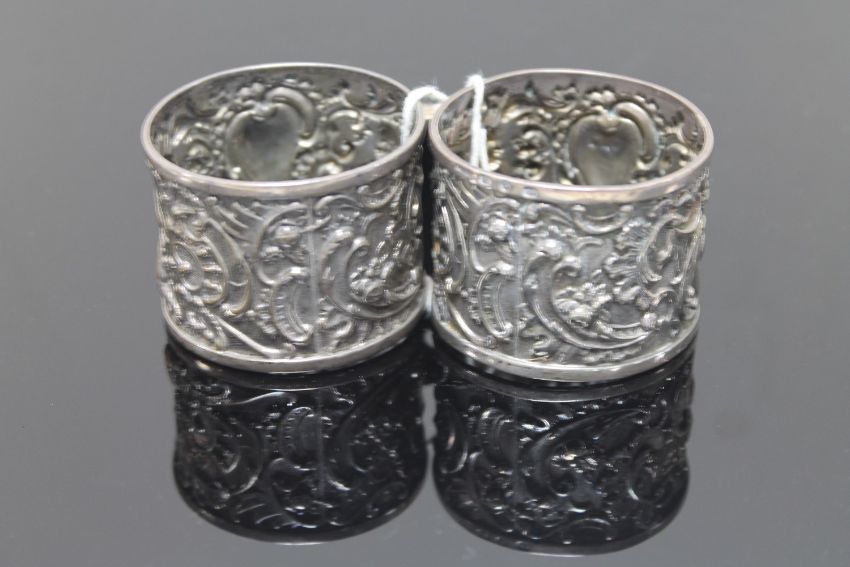 An ornate pair of silver napkin rings with putti playing drums (2)