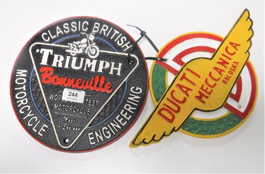Two cast iron motor cycle plaques - Triumph Bonneville & Ducati