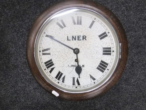 A circular oak cased wall timepiece, later signed LNER Lincoln