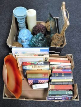 Two boxes of glass Buddha head, glass bowls, ornaments, candles, small quantity of assorted books etc