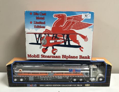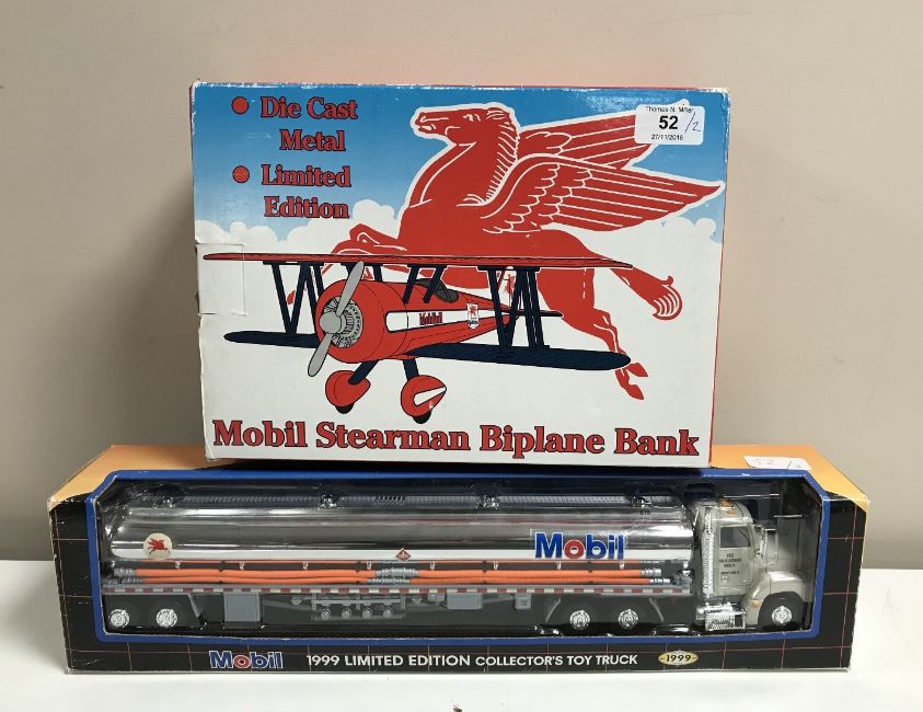 A Mobil Stearman Biplane Limited Edition Die Cast Novelty Coin Bank, in original packaging and box, together with a 1999 Limited Edition Mobil Collector's Toy Truck, also boxed.