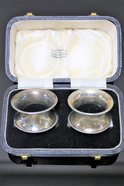 A pair of silver napkin rings, boxed.